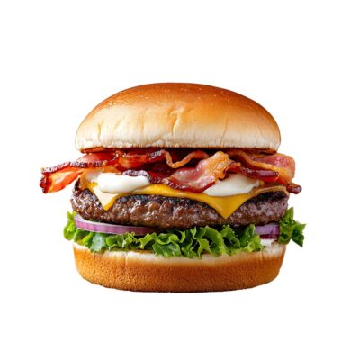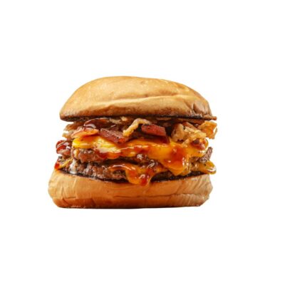 Two 75g fresh beef patties, cheddar cheese, smoked beef bacon,...